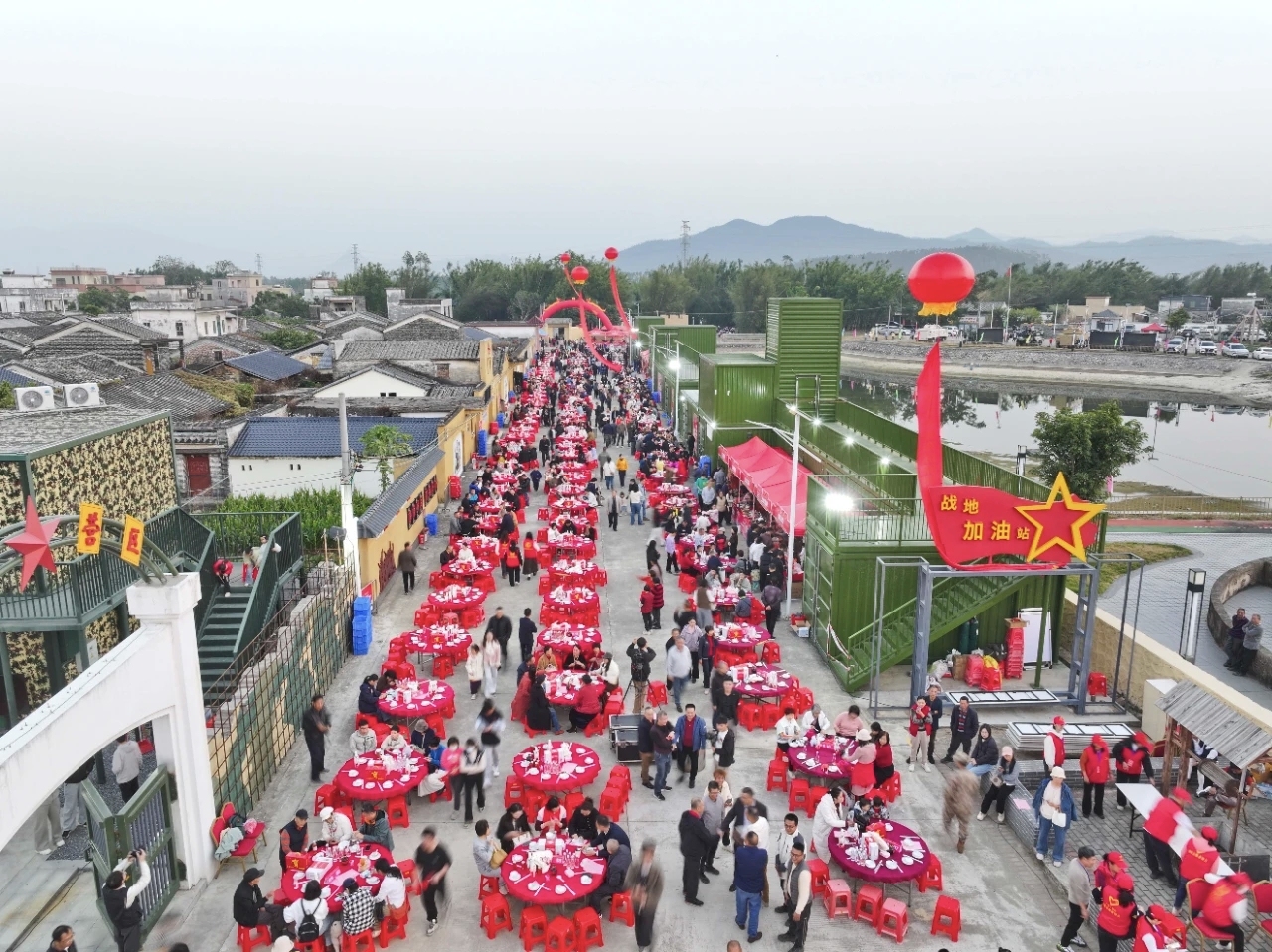 当晚六点,表竹村星空璀璨,腊香四溢,红色旅游区广场上数十张圆桌整齐排开,备受期待的腊味大宴与“星火传唱红歌会”在红色热土上温暖开席。