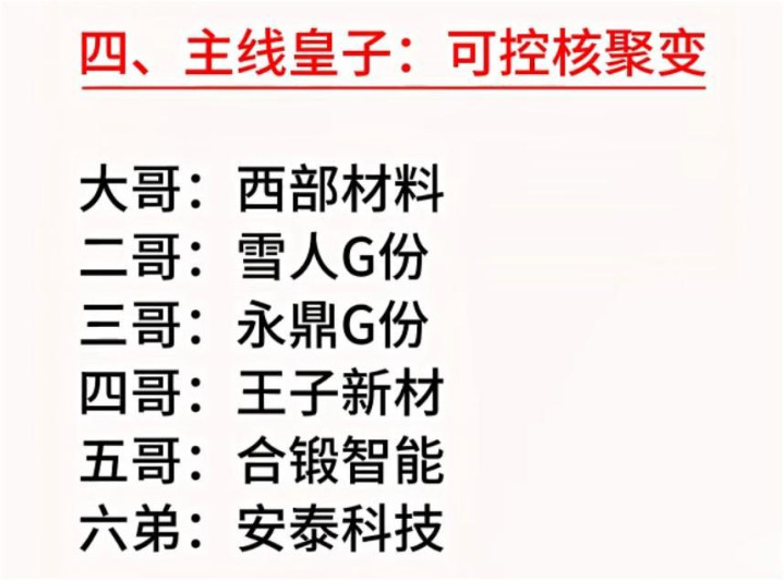 - 雪人股份、永鼎股份、王子新材、合锻智能、安泰科技也在核聚变的设备制造、技术研发等环节有所布局。虽然可控核聚变技术还在研发阶段,但一旦取得突破,将对能源领域产生革命性影响,是长期值得关注的赛道。